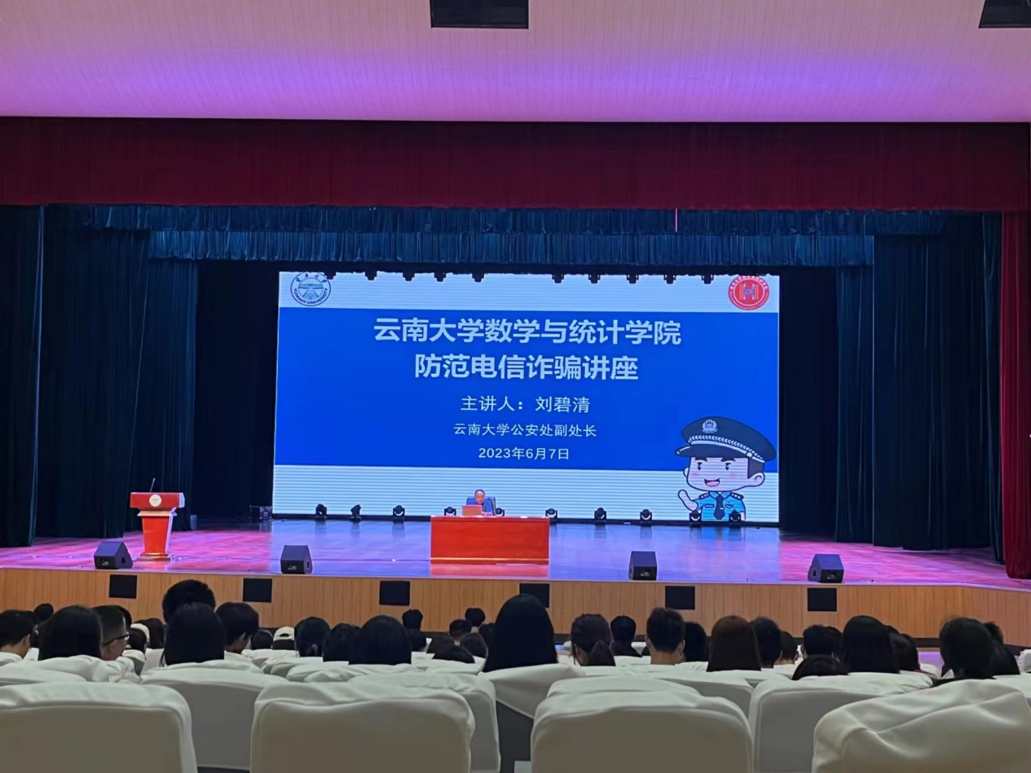 为切实提高广大师生对电信网络诈骗犯罪的识别与防范能力,普及防诈骗知识,维护师生的切身利益,预防各类网络电信诈骗事件,营造和谐平安的校园环境。 2023年6月7日中午13:00,公司在员工会堂举办防范电信诈骗主题教育讲座,讲座邀请伟德国际1946bv官网公安处刘碧清副处长主讲,公司党委副书记杜芳芳老师主持,各年级辅导员、班主任及1000余名同学参加本次讲座。