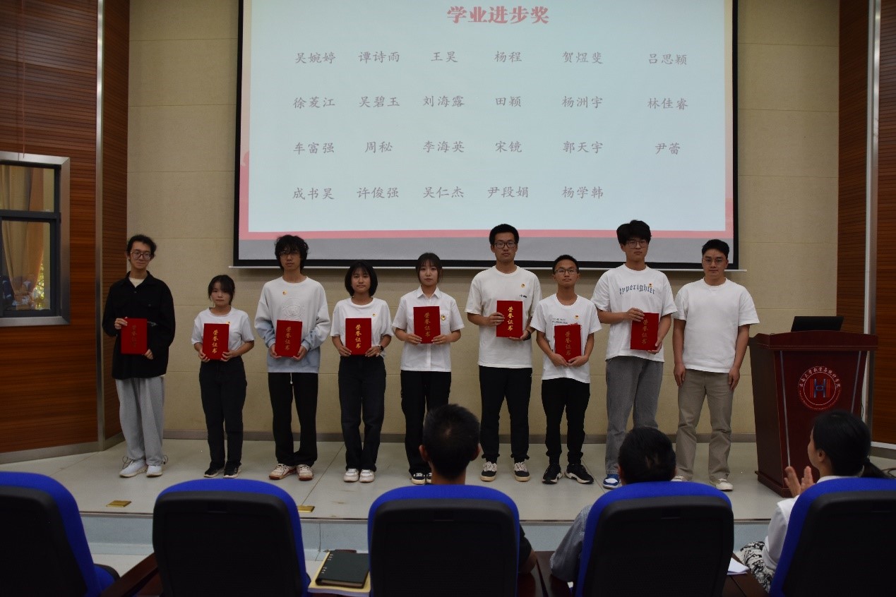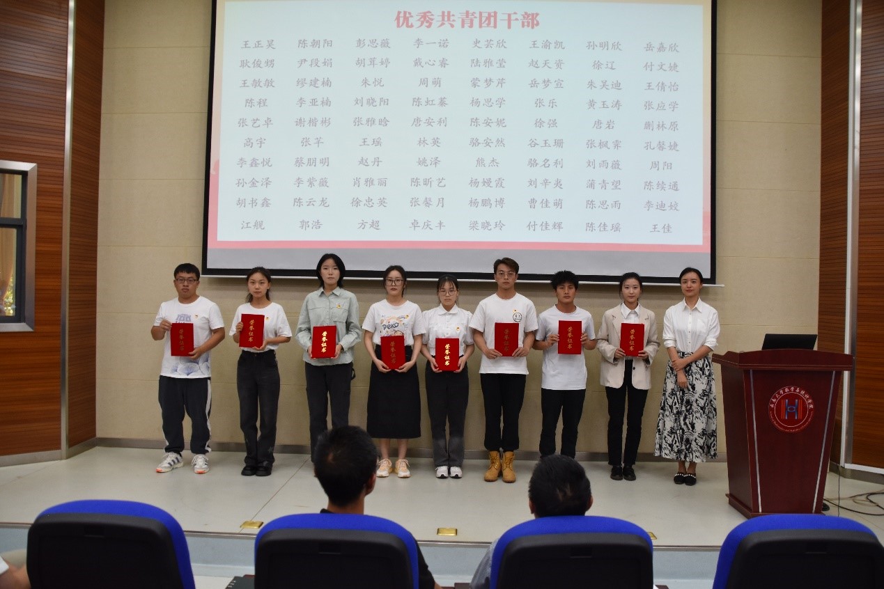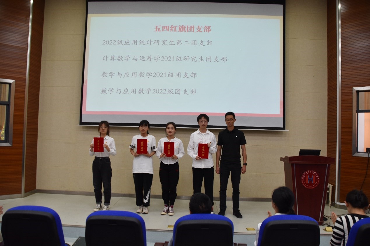 第五项议程:颁奖环节。为表彰先进,宣传先进,激励全院青年、团员、团干部和组织奋发有为、再创佳绩,学院团委决定授予2022级应用统计研究生第二团支部等4 个团支部“红旗团支部”称号,授予陈朝阳等8位同学“先进工作者”称号,授予王正昊等74位同学“优秀共青团干部”称号,授予李京京等114位同学“优秀共青团员”称号,授予吴婉婷等22位同学“学业进步奖”称号,授予苏宇杰等75位同学“优秀毕业生”称号,授予马子璇等60位同学“优秀青年志愿者”称号,授予3个志愿团队“优秀志愿服务团队”称号。各获奖代表依次上台领奖。