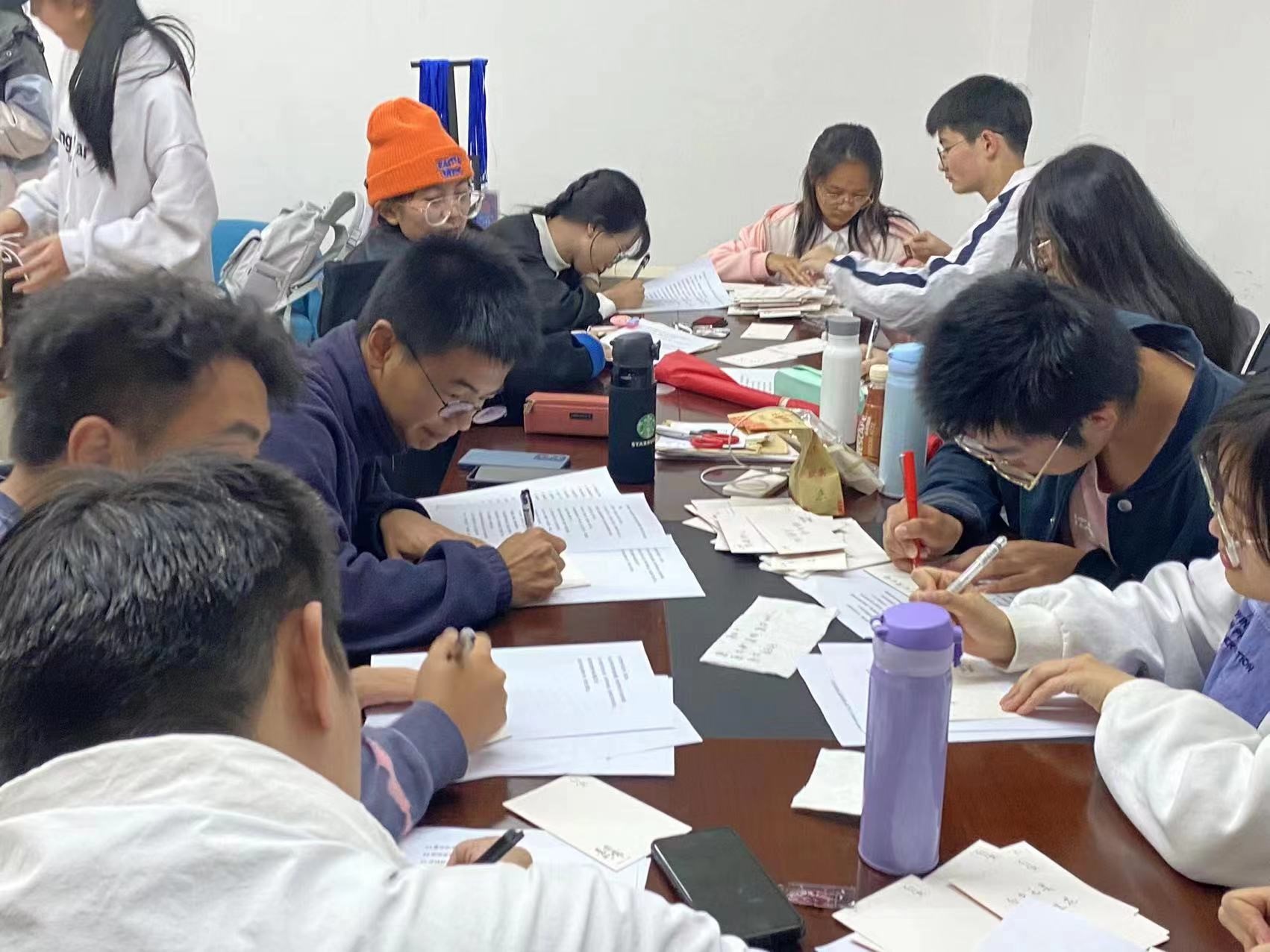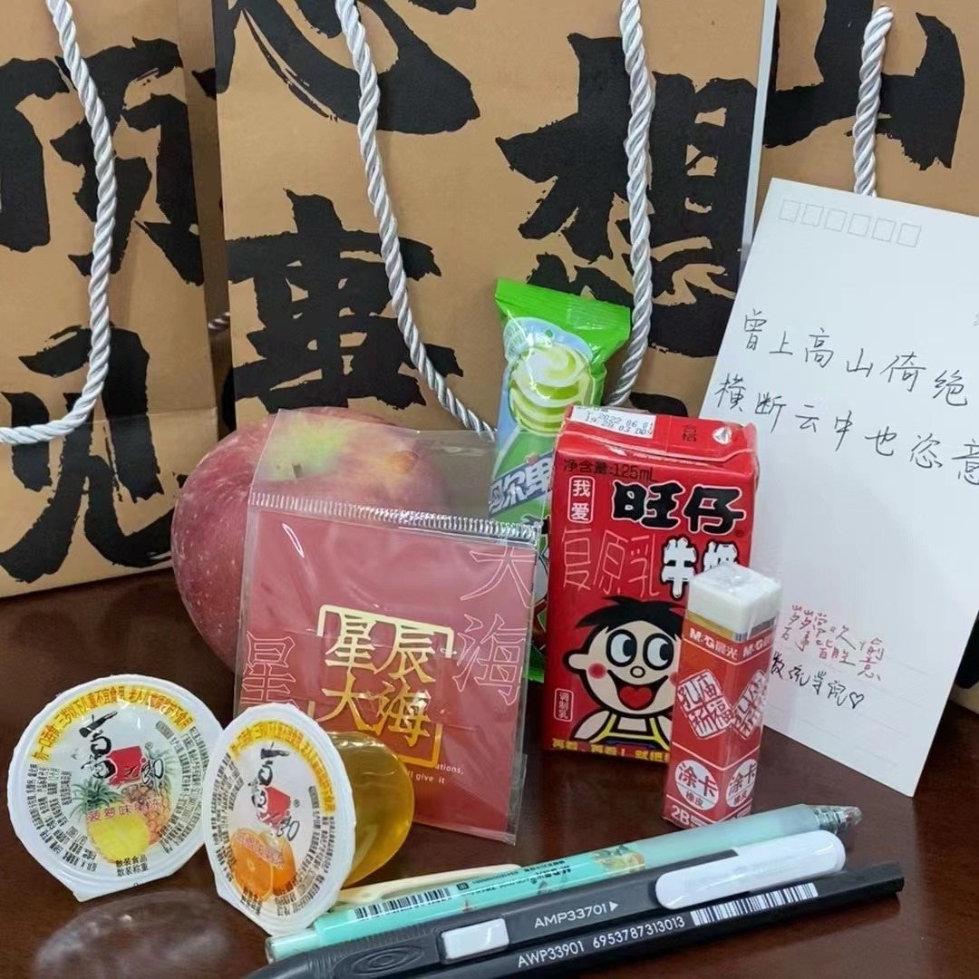 在考研礼包中,除了文具、水果、零食外,每一份礼包还含有一张由公司青协自律委的同学为考研学长学姐写下的祝福明信片。这一张张明信片寄托着学弟学妹的美好祝愿,希望能够在这寒冬之际,为备战考研的学长学姐们带来一份温暖,助力他们的考研梦。