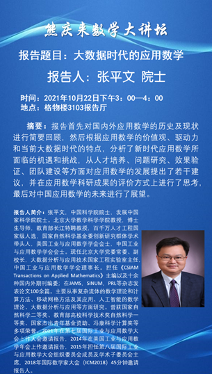 在本次讲座中,张平文院士先后从数学学科特点、应用数学的价值观等方面对国内外应用数学的历史与现状进行回顾,之后深刻剖析新时代应用数学所面临的机遇与挑战,从人才培养、问题研究、效果验证、团队建设等方面对应用数学的发展提出若干看法,最后对中国应用数学的发展前景进行观察与预测。