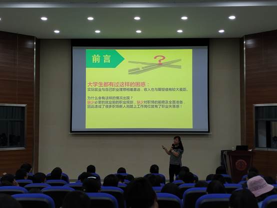 讲座开始杨煦怡讲述自己的自身经历,提出前言老员工都有过的困惑,困惑为实际就业与自己职业理想差距甚远,收入也与期望值有较大差距。并分析这样情况出现的原因,进行职业规划要考虑的外部因素和自我分析。并且举了相关例子以及解决办法,加深了同学们的理解。