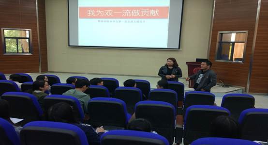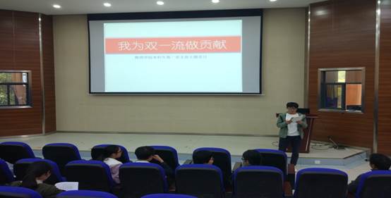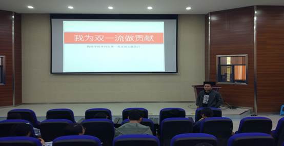 2018年4月27日下午,数统学院本科生第一党支部于格物楼3103报告厅开展了以“我为双一流做贡献”为主题的党日活动。会议活动期间,在党支部副书记彭程同志及教师党员彭玫同志的主持指导下,全体员工党员、预备党员和发展对象认真讨论学习,决心深刻贯彻落实“一流党建”方针,齐心协力为建设双一流大学做贡献。