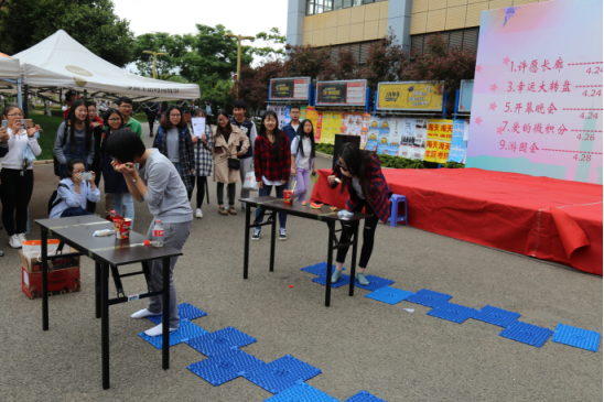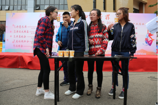 中午12点在楠苑食堂门口进行游戏比拼第一轮游戏全军出击,参赛者穿过指压板,去吃选好的食物,依次轮流,食物全部吃完计算时间第二轮游戏则是流觞曲水,用嘴叼着装满水的纸杯,说出关键字,分别说一遍,接着传递给队友,规定时间看说出的数量,其中卡片里的我爱数学分析在场气氛推入了高潮。