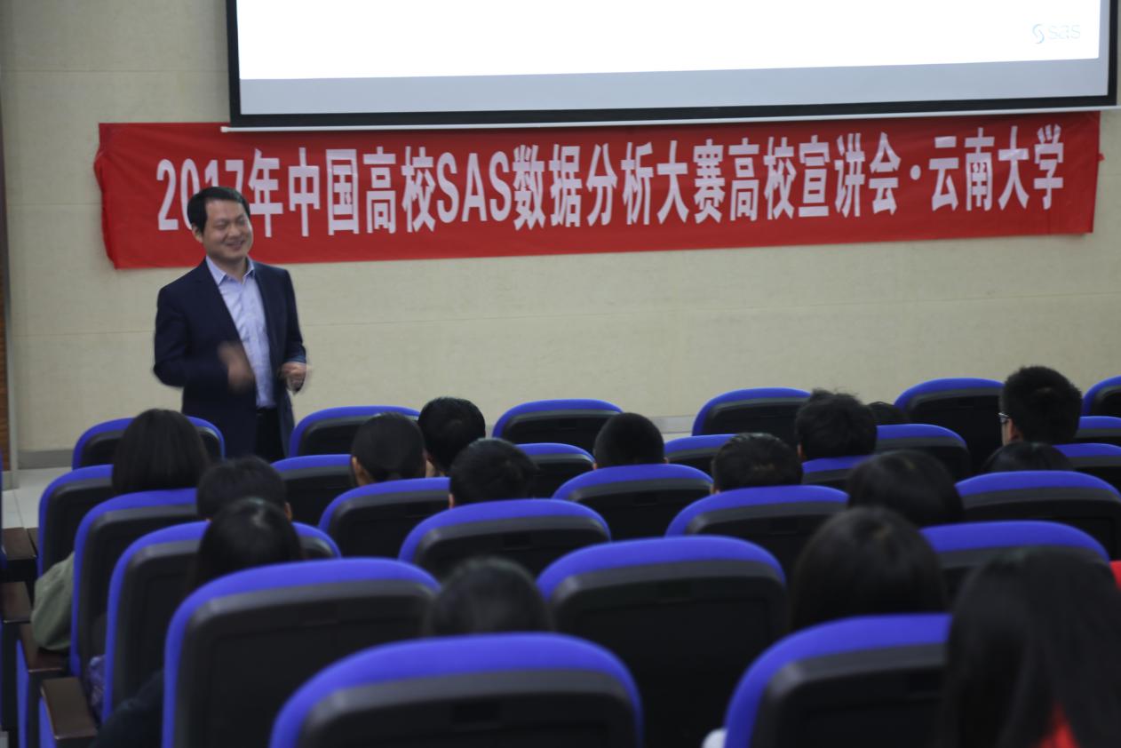 之后,赵老师向同学们介绍了“汇丰杯”中国高校SAS数据分析大赛并回顾了历届大赛,对2017年大赛的流程安排和奖项设置进行讲解。2017年大赛合作伙伴之一广州迪奥信息有限公司的员工方芳来到了宣讲会,向大家介绍了广州迪奥有限公司的主营业务板块以及SAS职业角色认证体系、SAS精英会和SAS大学-精英学院。