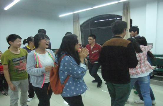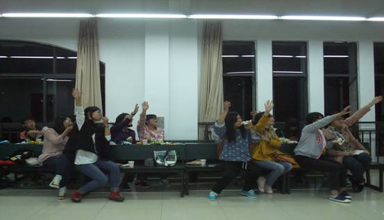 下面就是最后一个环节,“梅花朵朵开”的游戏,在紧张而有趣的气氛中决出了胜负,输的人的惩罚就是说出一个ABB型的词语,这又是考验他们的语文功底了,也带来了欢笑。时间总数偷偷在指缝间溜走,伴随着大家的阵阵笑声,本次活动也接近了尾声,大家都不舍地离开了活动现场。