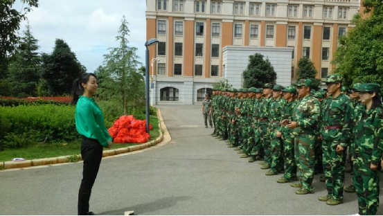 在同学们殷切崇敬的目光中,学院的老师们们向我们走来,他们的到来在辛苦的军训生活中为同学们带来了新的动力,使同学们深切体会到了领导老师们对员工的关爱。所以我们的口号比平时更响亮,我们的身姿比平时更挺拔,我们渴望老师看出我们的朝气、决心与昂扬的斗志。辅导员李丹老师向我们一一介绍了本次慰问的相关领导与老师,同学们表示了热烈的欢迎。公司党委副书记杜芳芳老师对我们进行了鼓励,她教育我们,军训是进入大学的第一课堂,尽管过程辛苦,但她仍坚信我们会把这堂课上好,交出一份令教官、老师、自己都满意的答卷,同时,杜老师也对教官的辛勤付出表达了尊敬与感激之情。