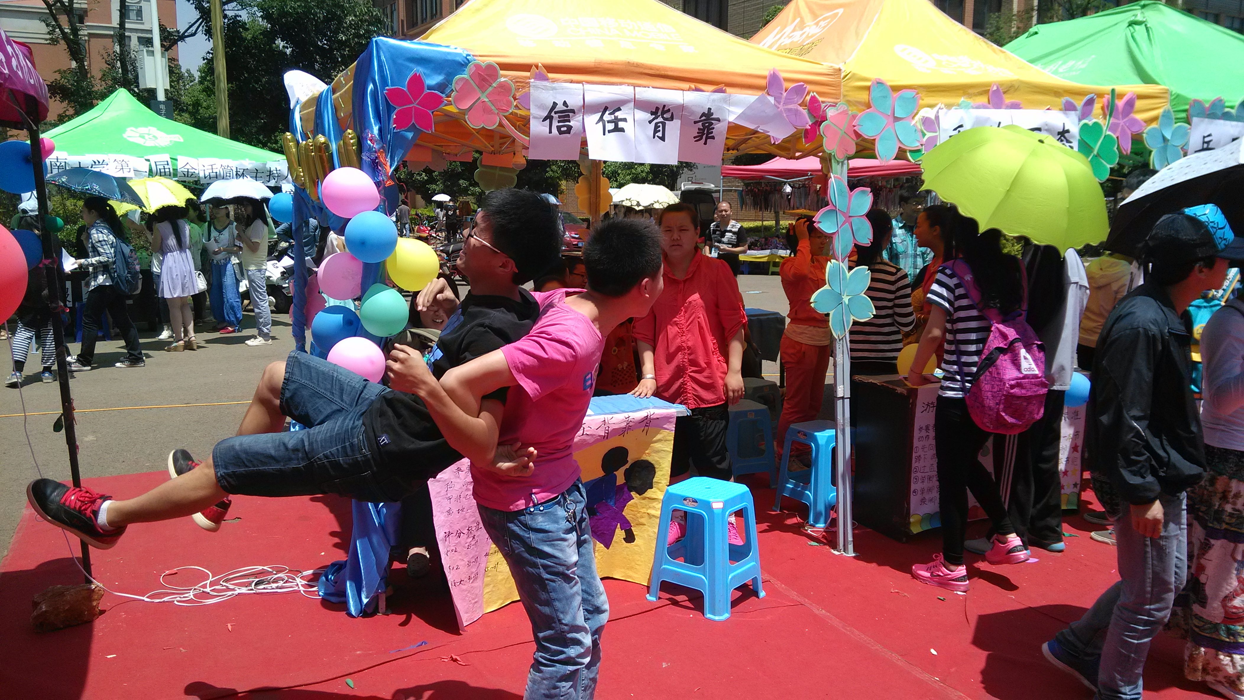 中午十二点,各学院代表队参与的活动正式开始,首先是在楠苑食堂外舞台上的答题环节,答题过后各个代表队开始寻找由公司员工会、团委布置在校内各处的活动摊点---定点投篮,开门大吉,猜灯谜,我扔你猜,科学实验站,心有灵犀等七个活动。这些活动从梓苑食堂到楸苑篮球场遍布校内各处,其中的我扔你猜、科学实验站、心有灵犀三个摊点特意设在了不易找到的位置,为游戏增加了一些难度,但也使得游戏显得更加有趣。