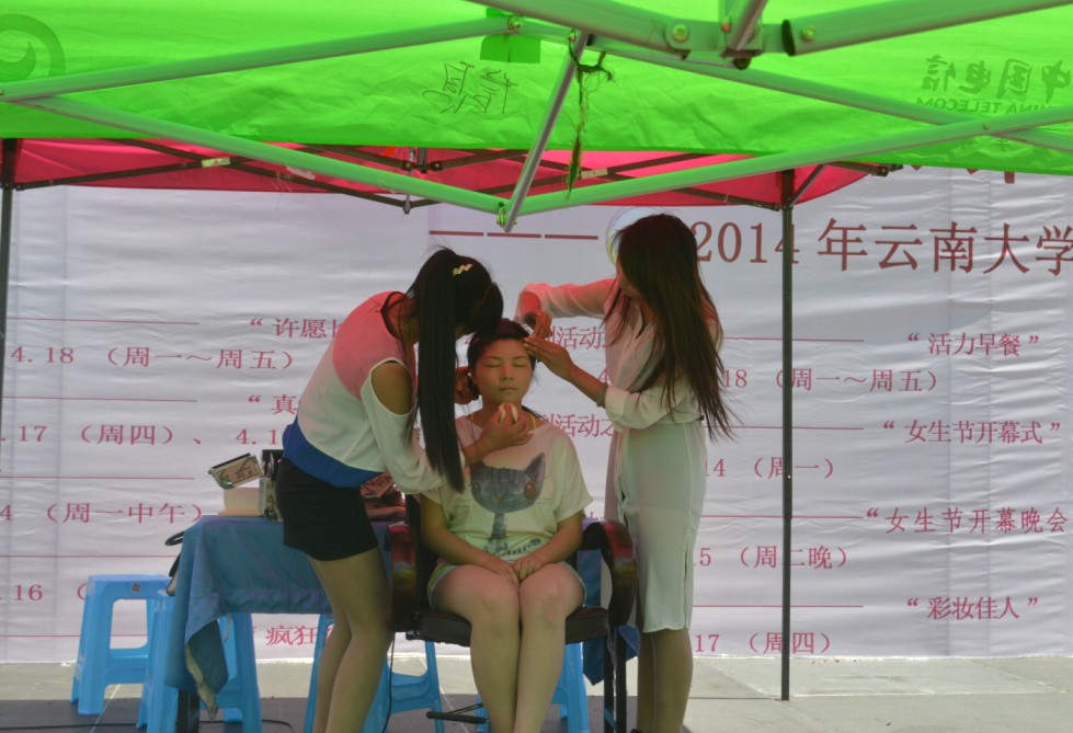 2014年4月17日中午,在呈贡校区楠苑食堂外的舞台上,第九届女生节系列活动之彩妆佳人正式开始,公司员工会、团委特意请来了专业的化妆师来为同学们提供一些免费的化妆及化妆指导,包括如何化淡妆,如何修眉,如何编适合自己的发型等等。