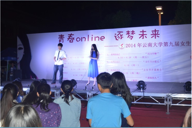 4月18日晚,在伟德国际1946bv官网呈贡校区,公司女生节系列活动之青春嘉年华晚会在楠苑食堂门口举行。作为这届女生节的谢幕,晚会中上演了很多精彩节目。