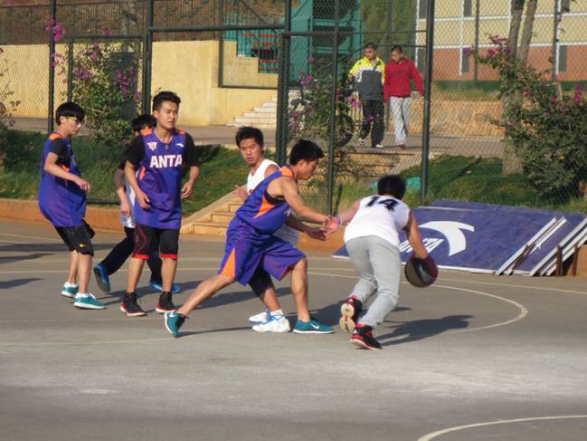 球场上人影绰绰,双方队员你来我往,精彩镜头不断上演,这边一个“百步穿杨”,那边一个“凌波微步”,队员们娴熟精妙的篮球技术引来观众们的阵阵喝彩与掌声。紧张的比赛氛围中洋溢着青春的热情,在高度专注与紧张的气场里,四场比赛似乎过得十分快,双方比分追得非常紧,势均力敌的情况下,比赛进入倒计时。