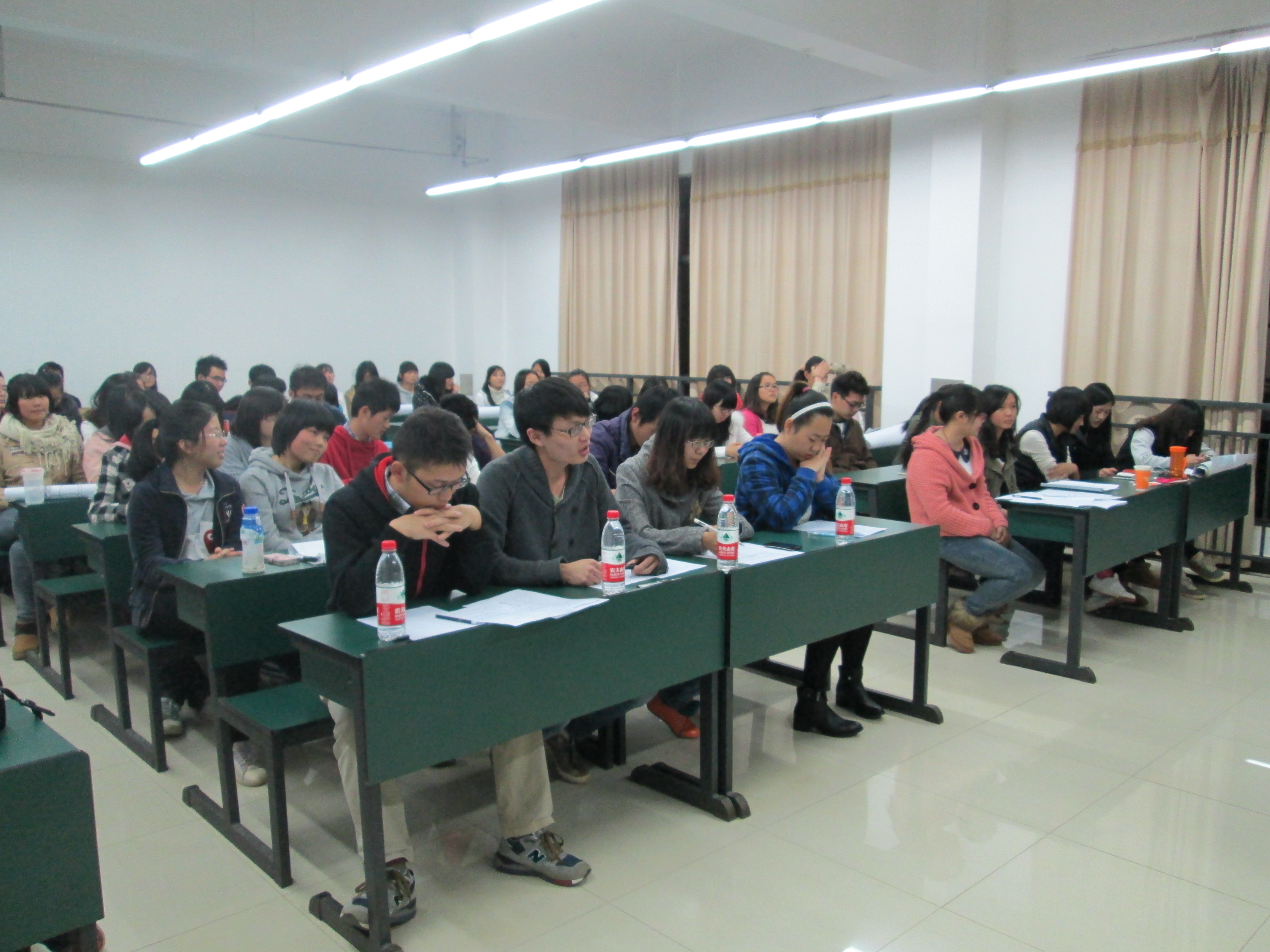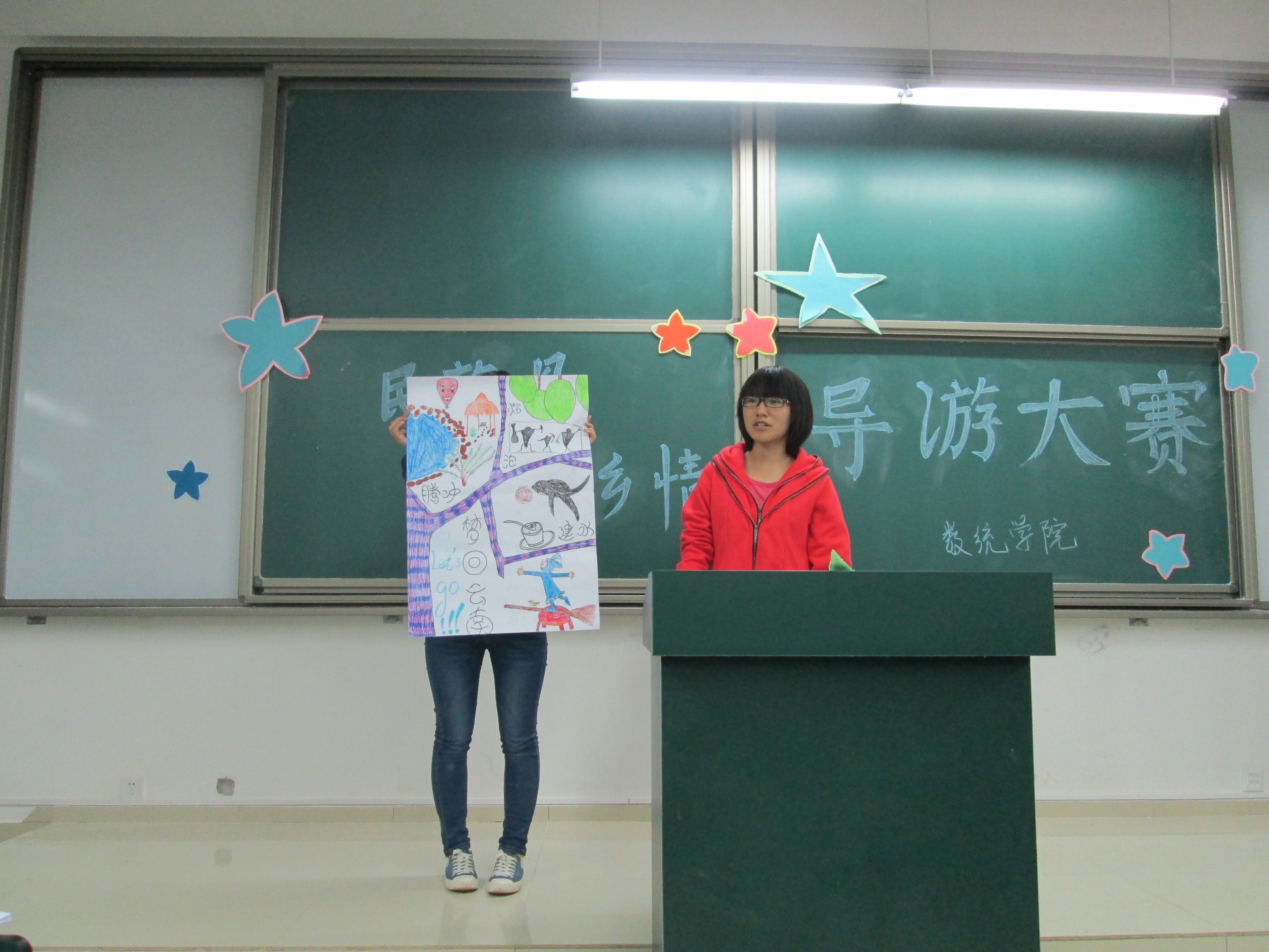公司”民族风 家乡情”导游大赛初赛于2013年11月23日晚七点格物楼2104正式开始,由数统学院12级员工施超担任主持人,还有员工会副会长及团委副书记做评委。