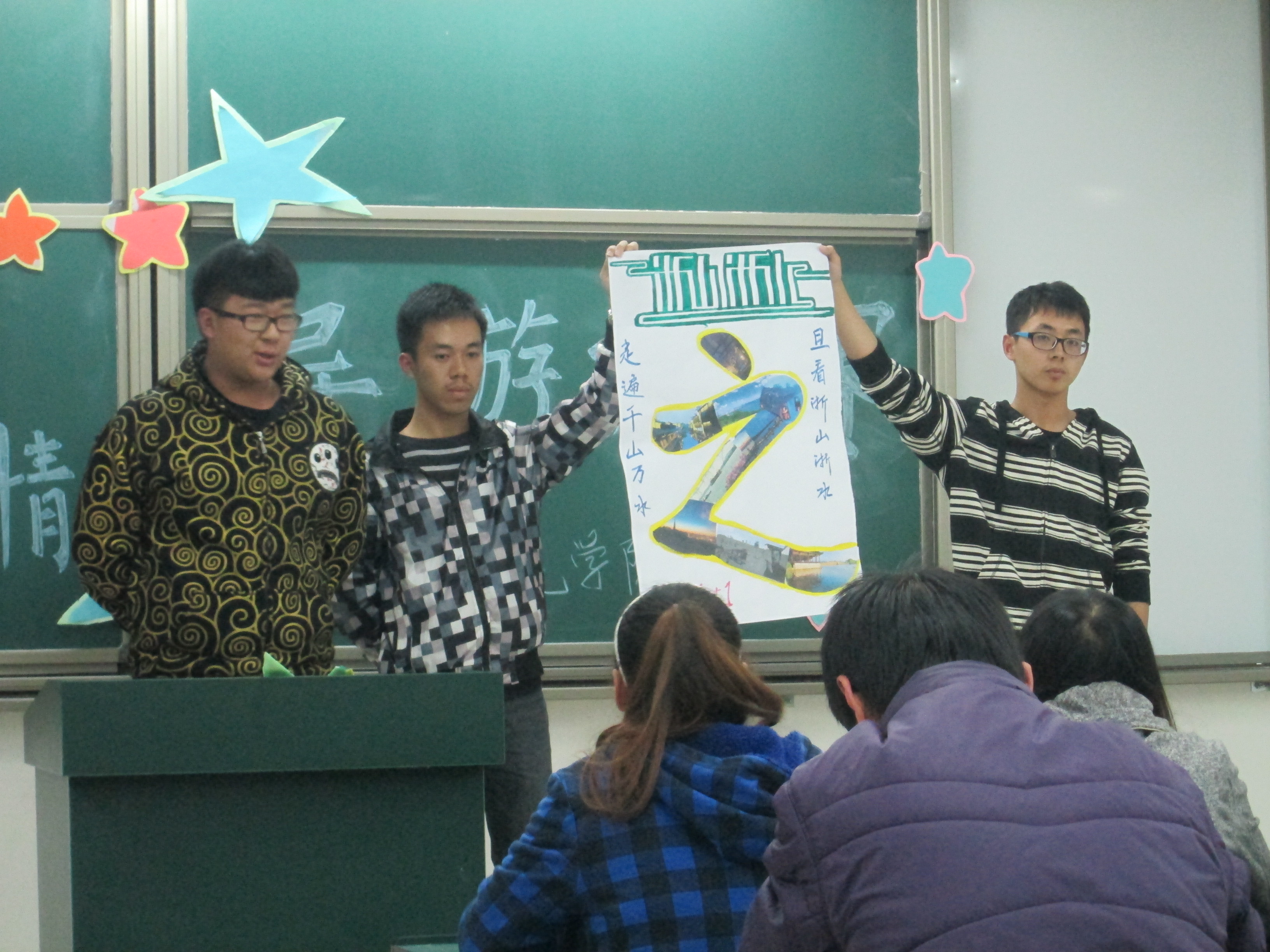 待各位组长上前抽签后,由主持人宣读了上场顺序。第一组很快便走了上去,两个同学举着海报,另一位在前面进行导游式的讲解,那种陶醉仿佛我们和他一起走进了他的家乡,同他一起畅游山林。时间一分一秒的走过,五分钟又怎够一位思乡心切的游子表达对自己家乡的热爱,一位学长举起了“时间到”的牌子,他便只能意犹未尽地离开了讲台,各位评委也认真的听着他们的讲说,并作着笔记。一组又一组的小队施展着自己的才华,有一组四川队是由三个女生组成,她们用普通话和家乡话交叉着介绍着四川的吃的,玩的,还有各种民族风情,让人真的有一种立即到四川去旅游的冲动,那里太诱人了,最后,她们还为我们献上了一首家乡民歌,是家乡情更好的流露出来。最让人心想深刻的还要数浙江队,他们的海报极具特色,总体有一个“之”字构成,其中又饱含更深的含义,将浙江特色生动地表现了出来。三个男生有各自不同的风格将浙江的柔美表现的淋漓尽致,使人有种不去一趟浙江妄来人世走一遭的感觉。每四个小组结束后,都回得到评委们细心的点评,有表扬,有批评,指出了错误,亦发现了优点。