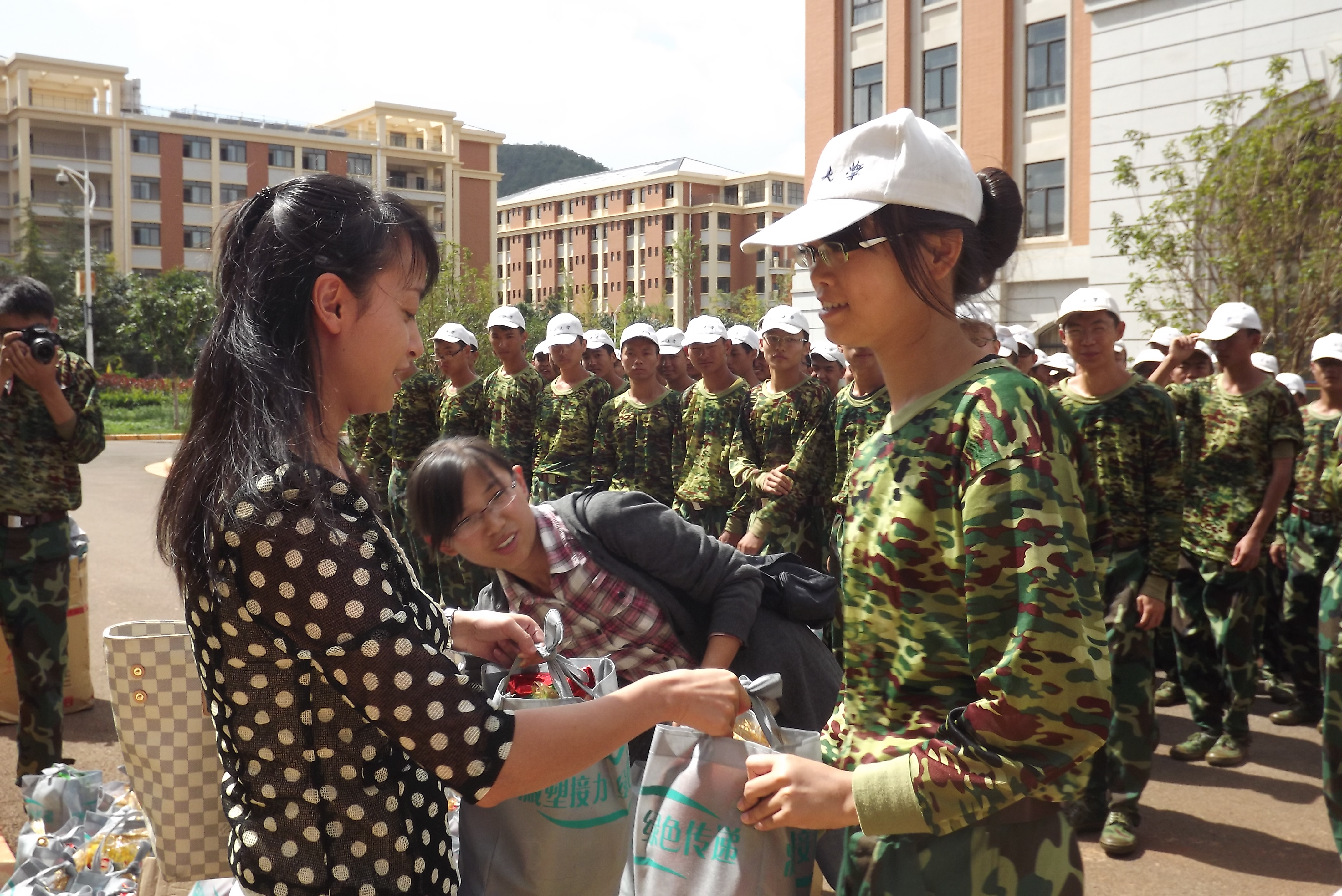 2012年9月10号上午,学院领导在呈贡校区格物楼3栋前对数统学院参加军训的2012级本科生同学进行了亲切的慰问。公司党委副书记杜芳芳老师对同学们的精神风貌给与了肯定;同时提醒同学们注重锻炼的同时也应该保护好自己的身体,以崭新的姿态迎接未来的老员工活。随后,慰问的领导为同学统一发放了慰问品,2012级的全体同学深切地感受到了在这个大家庭中的温暖,懂得了学院领导对同学的真切关怀与呵护,在未来几天的军训路途中,大家会更加满怀激情,奋勇向前。