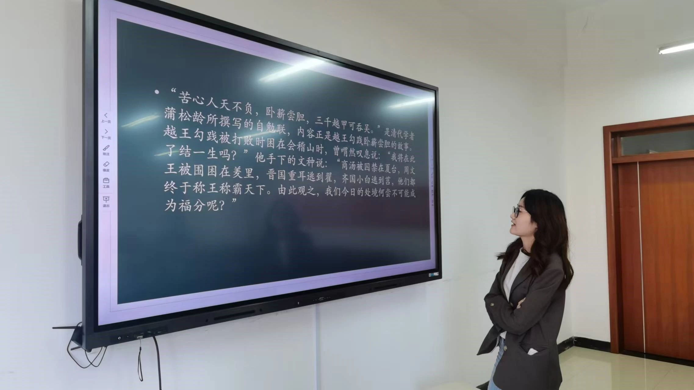 第三小组的赵霜同学以视频短片的形式生动呈现了《史记·越王勾践世家》的精彩内容。这段故事深刻展现了越王勾践坚韧不拔、自我激励的崇高精神,瞬间触动了台下同学们的心弦,引发了大家深刻的思考。在当今这个充满挑战与机遇的社会里,我们依然可以从“卧薪尝胆”这一经典故事中汲取无尽的智慧与力量。