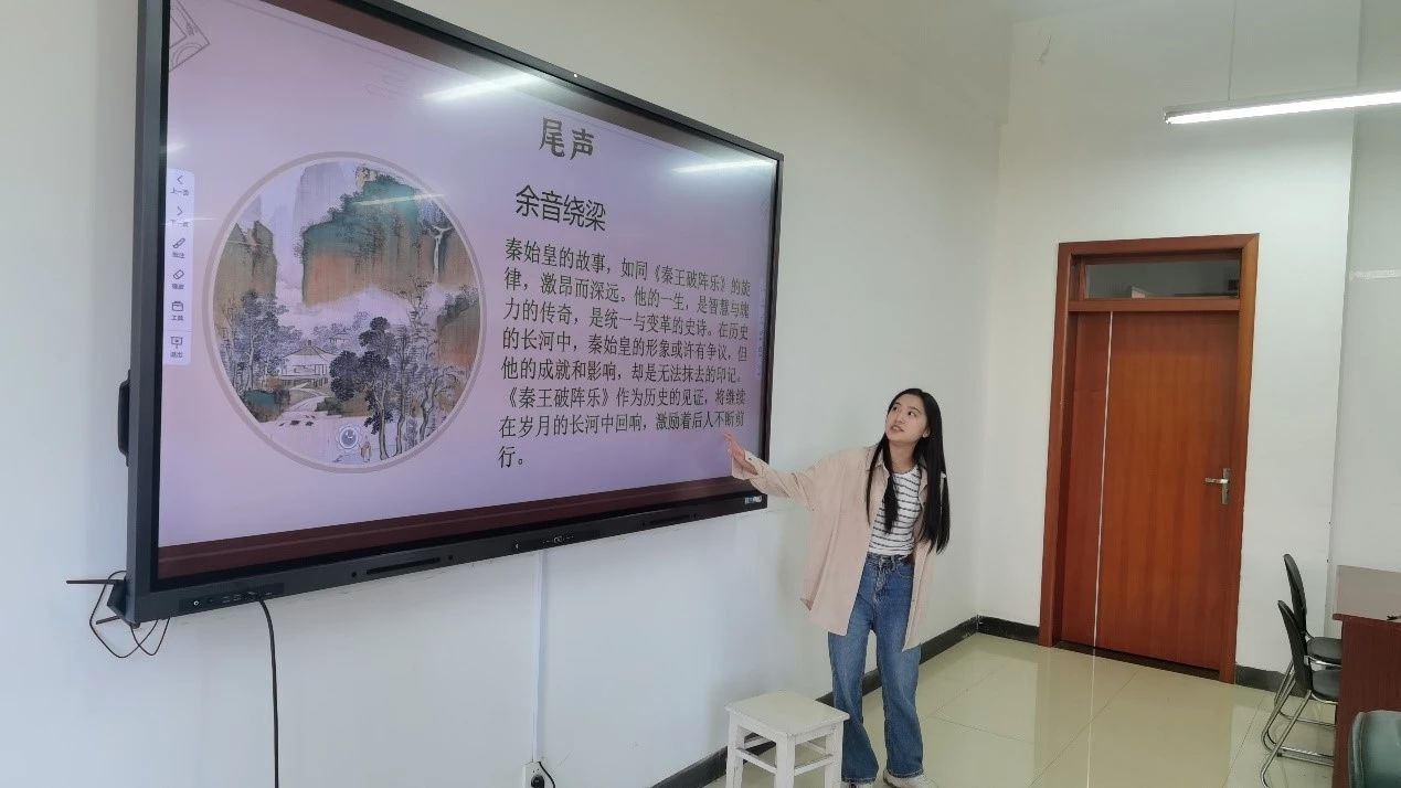 第二小组的邓茜同学为我们精彩讲述了《秦王破阵乐》的故事,伴随着激昂的号角与铁骑奔腾的旋律,秦始皇的军事壮举仿佛一幅幅生动的历史画卷在我们眼前徐徐展开。通过这些描绘,我们深刻感受到了秦始皇在内政改革上的坚定与果敢。他勇于废除旧制,积极推行新法,其麾下的铁骑更是势不可挡,不仅成功统一了中原大地,还将边疆地区牢牢稳固,这充分展现了秦始皇卓越的军事智慧和深远的战略眼光。这段历史不仅令人震撼,更为我们提供了宝贵的启示与借鉴。